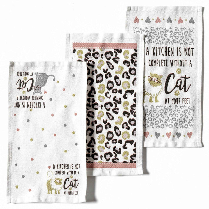 Set of 3 Cat At Your Feet inspired tea towels from Country Club each featuring a different design. Ideal for drying pots and glassware as well as hands in a busy kitchen