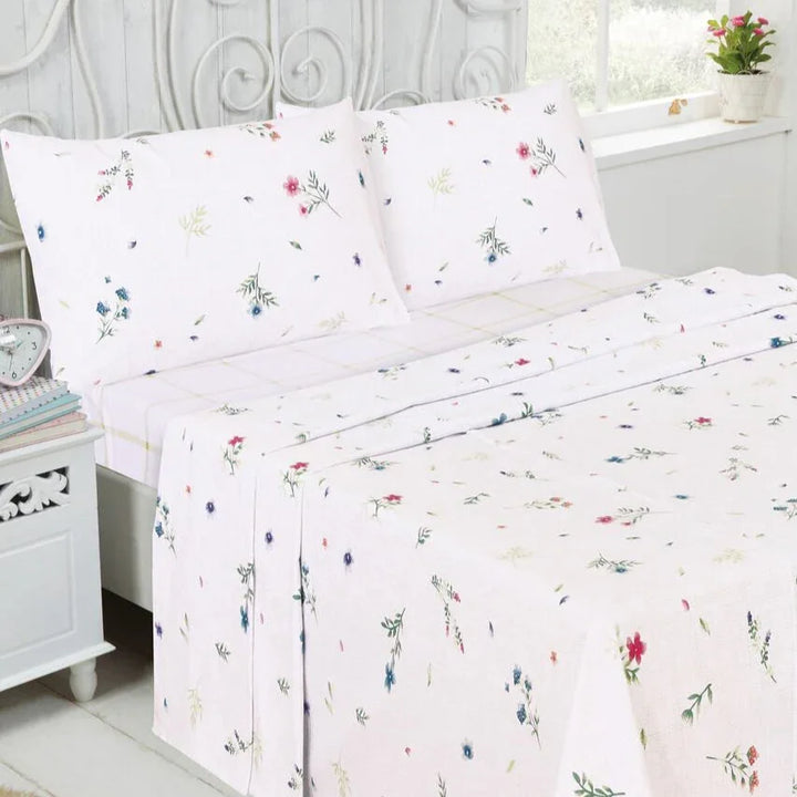 The Meadow Floral Sheet Set showcases a gentle and dispersed floral pattern, evoking the natural beauty of a blooming field. Small, stylized wildflowers and delicate leaves are scattered organically across the white fabric, creating an airy and relaxed feel. Crafted from soft, breathable fabric, this set promises both comfort and a touch of nature's beauty, making your bedroom a peaceful sanctuary.